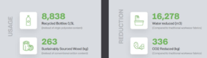 Voor deze collectie kozen we bewust voor eco-wear. En dat is meer dan een mooi woord. In elke vezel zit een verhaal: zo kregen maar liefst 8.838 gerecycleerde plastic flessen een tweede leven. Ook duurzame houtvezels maken deel uit van de stof die we dragen.