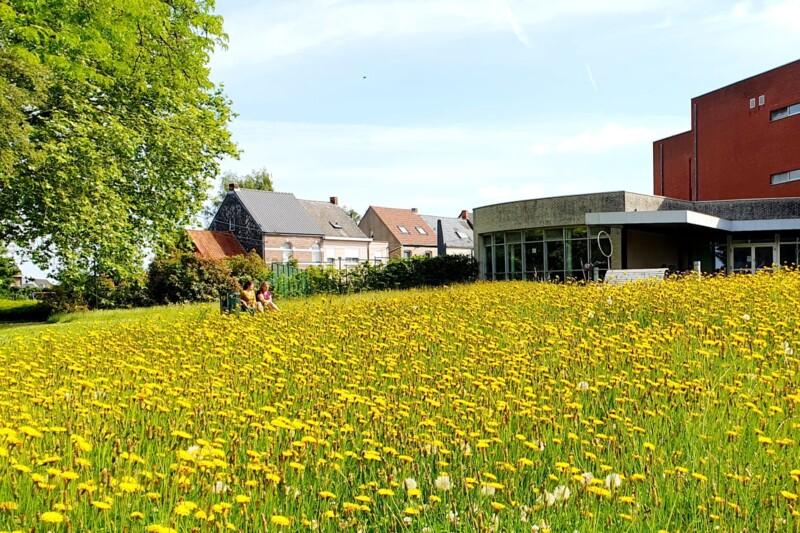 Onze groendienst startte in 2024 alvast met een extensiever maaibeheer. Doordat we voorheen steeds maaiden en afvoerden was er een verschraald gazon aanwezig. Onderaan zie je een voor en na foto van het bloemrijk resultaat nadat gestopt werd met intensief maaien.